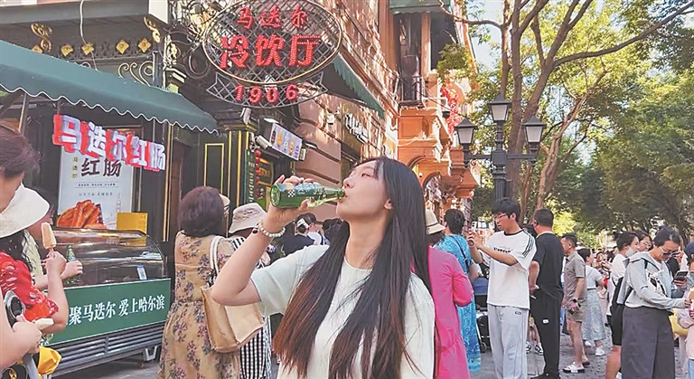 “这几天销量尤其好!”马迭尔品牌形象大使沈弘扬向记者介绍,高温天气里,冰棍成了消暑主角。记者注意到,柜台显眼位置整齐码放着一种淡青色玻璃瓶饮料,瓶身标签简洁清爽。沈弘扬随即热情推荐:“这是我们刚推的新品——‘马迭尔大白梨’,五元一瓶,卖得特别好!”据他介绍,这款饮料以东北特产南果梨的清爽风味为基底,融入细腻气泡,口感酸甜沁爽。