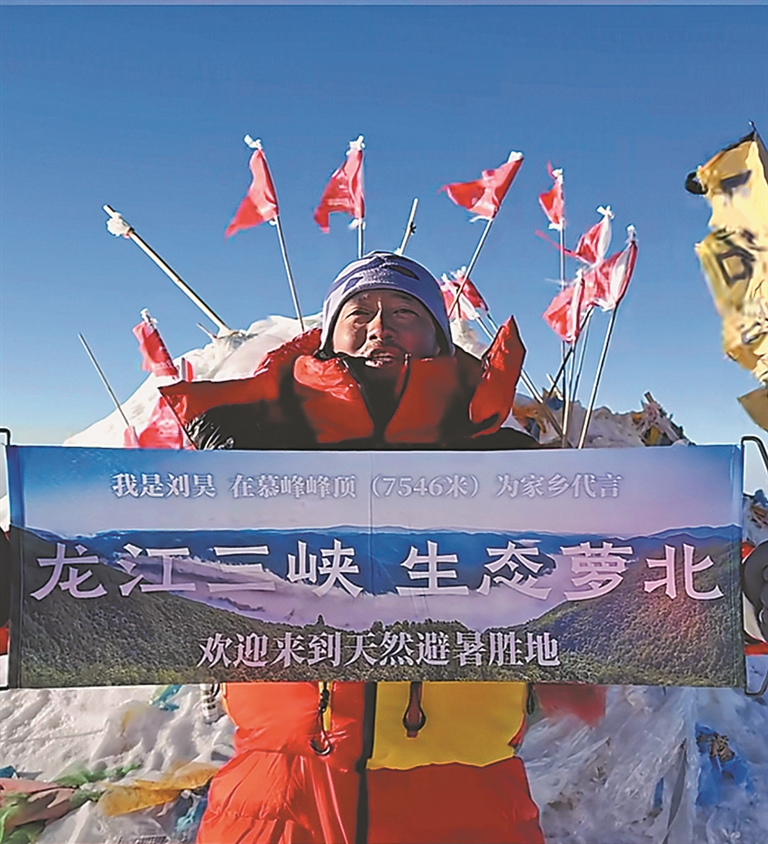 刘昊登顶后,虽然呼吸极为困难,仍在海拔7546米的慕士塔格峰之巅为家乡萝北代言:“龙江三峡 生态萝北”,欢迎大家来做客。