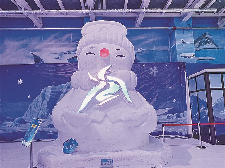 走进场馆,首先看到的是1963年哈尔滨市第一届冰灯游园会上的经典雪雕作品“万象更新”,仿佛带大家于冰天雪地中开启了一场“穿越”之旅。旁边的“迎宾雪人”,是复刻2024-2025冰雪季哈尔滨太阳岛宾馆的雪人雪雕,它就像是一个特殊的迎宾员,用圆滚滚的身体和可爱的笑脸欢迎着来自世界各地的游客。