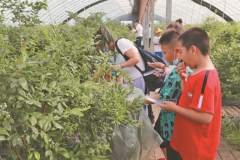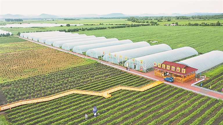 在蓝莓品鉴采摘区,饱满多汁的蓝莓挂满枝头,吸引游客亲手采摘、品尝,沉浸式体验“从枝头到舌尖”的新鲜。这片园区是伊春蓝莓产业多年深耕的丰硕成果,累计投入3483万元,定植蓝莓500多万株,棚室种植面积达96亩,2024年总产值突破1650万元,较2016年增长1.9倍。目前,已成为全国最大的蓝莓集中连片种植基地,充分彰显了伊春“生态产业化、产业生态化”的发展成效。