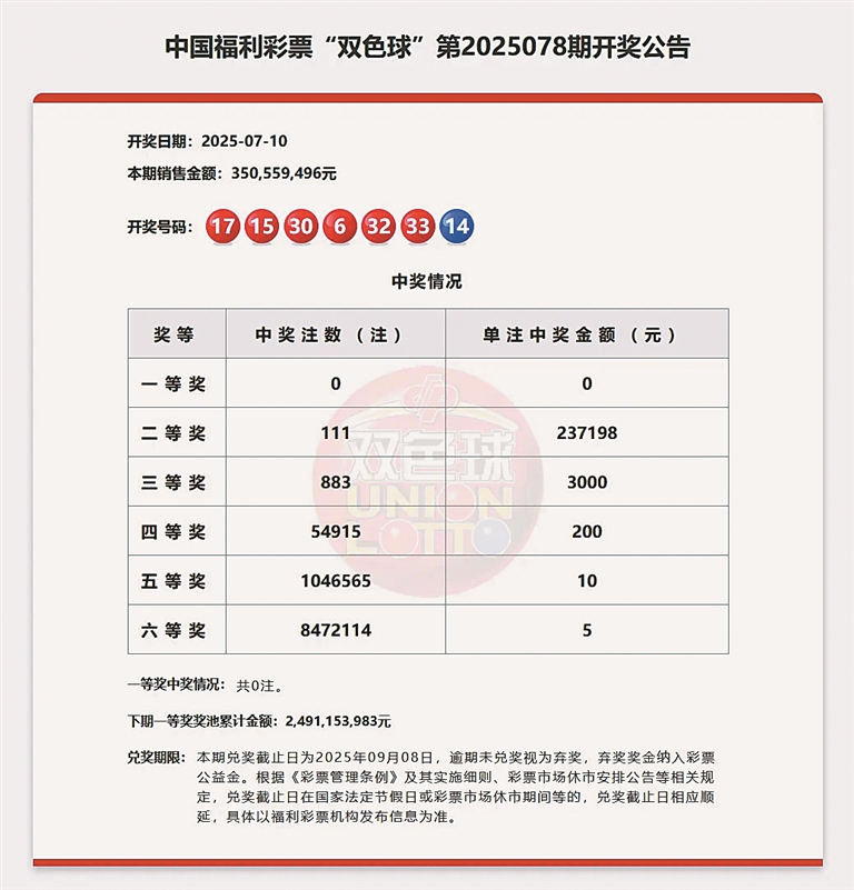 7月10日,双色球第2025078期开奖,一等奖没有中出,二等奖中出111注。奖池金额24.91亿元,本期销量3.50亿元,筹集公益金1.26亿元。
