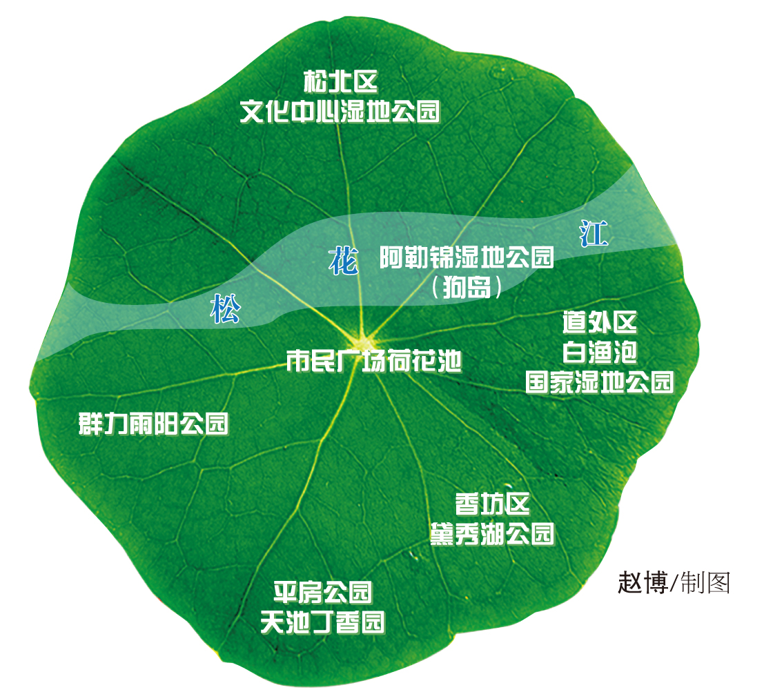道外区白渔泡国家湿地公园内设有2000多平方米的荷花池,荷花种植规模较大。荷花品种以粉红色为主,与芦苇荡、香蒲等水生植物形成丰富植被景观。每年7月下旬进入盛放期,赏花期持续约1个月,此时荷叶繁茂、荷花竞相绽放,一片江南水乡风貌。