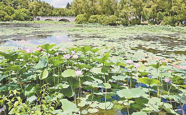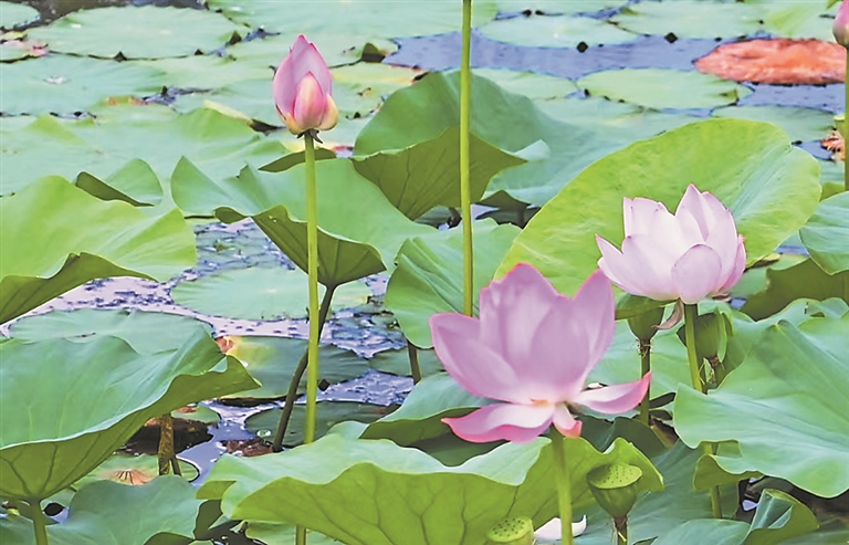 黛秀湖公园的荷花池宽阔,品种以粉红、白色为主。沿栈道漫步可近距离欣赏睡莲与荷花交织的景观,市民游客都能在此寻得一份难得的清凉与宁静。目前,黛秀湖公园的荷花已进入盛放期,适合前往观赏。