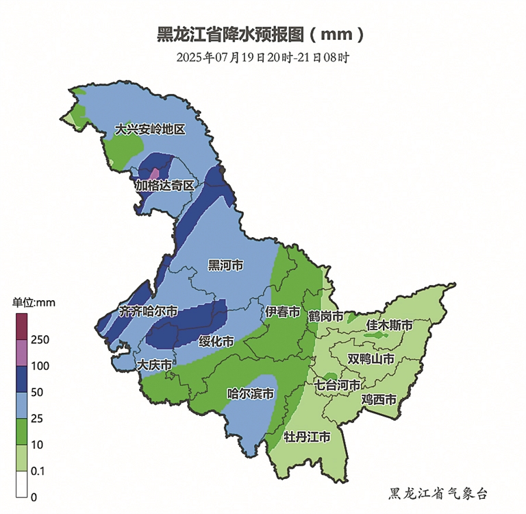 黑龙江省降水预报图(mm) 2025年7月19日20时-21日8时 黑龙江省气象台