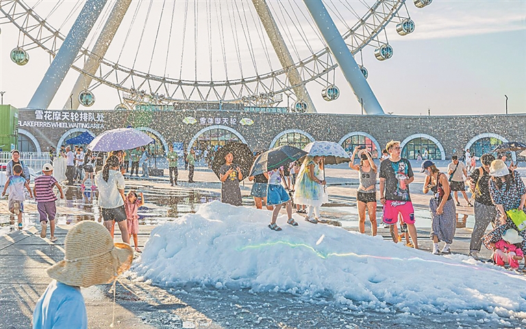 室外戏雪区的“盛夏飘雪”奇观,展现了哈尔滨冰雪科技的无限可能,是本届啤酒节的又一创新亮点。人们在30℃的室外,或是感受雪花漫天飞舞的浪漫,或是团雪球、打雪仗,体验冬天同款雪滑梯、雪地转转等项目。游客们纷纷感叹“太神奇了”“像做梦一样”。