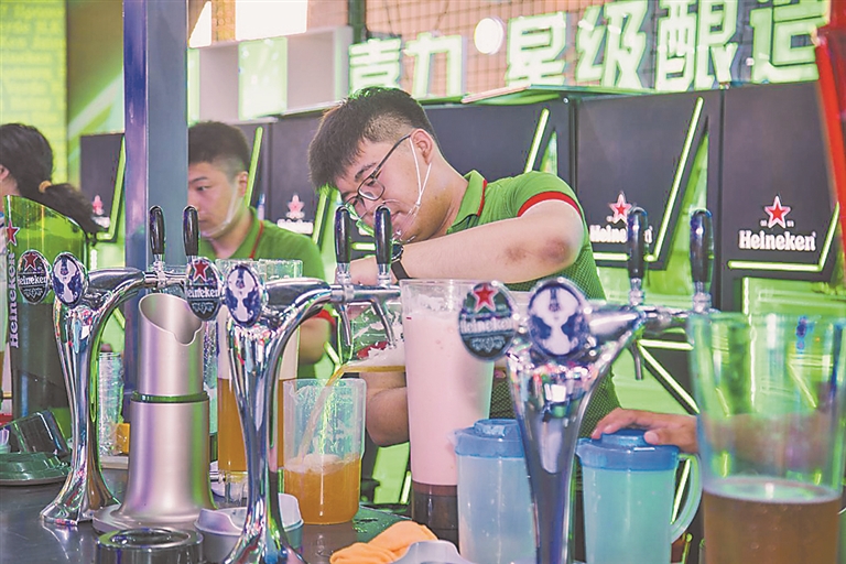 本届啤酒节共有6个啤酒大篷、9个特色啤酒花园。市民、游客不仅能畅饮来自10余个国家和地区的千余款啤酒,还能品尝各色美食,欣赏到电音、国潮、嘻哈等精彩纷呈的演艺活动,尽情释放压力、随心嗨玩。在这里,啤酒文化与电音激情奇妙碰撞,传统畅饮场景与潮流业态完美交融,酒香在欢声笑语中自然流淌。