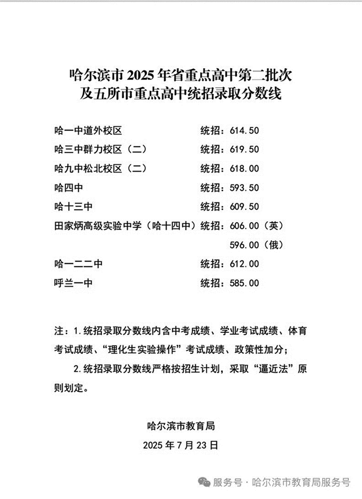 生活报讯 (实习生徐硕 记者吕晓艳) 23日,记者从哈尔滨市教育局获悉,哈尔滨市2025年省重点高中第二批次及五所市重点高中统招录取分数线划定,其中哈三中群力校区(二)分数最高,619.5分。统招录取分数线内含中考成绩、学业考试成绩、体育考试成绩、“理化生实验操作”考试成绩、政策性加分;统招录取分数线严格按招生计划,采取“逼近法”原则划定。