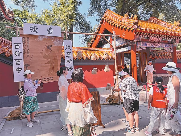 活动中最热闹的国潮集市,人潮涌动。这里不仅有琳琅满目的文物主题文创,还有各类非遗工坊和饮品铺子,以及备受小朋友们喜爱的互动游戏区。记者注意到,看着手工艺人们的现场制作,不少游客连连发出赞叹。投壶、踢毽子等游戏,更是让孩子们玩得不亦乐乎。