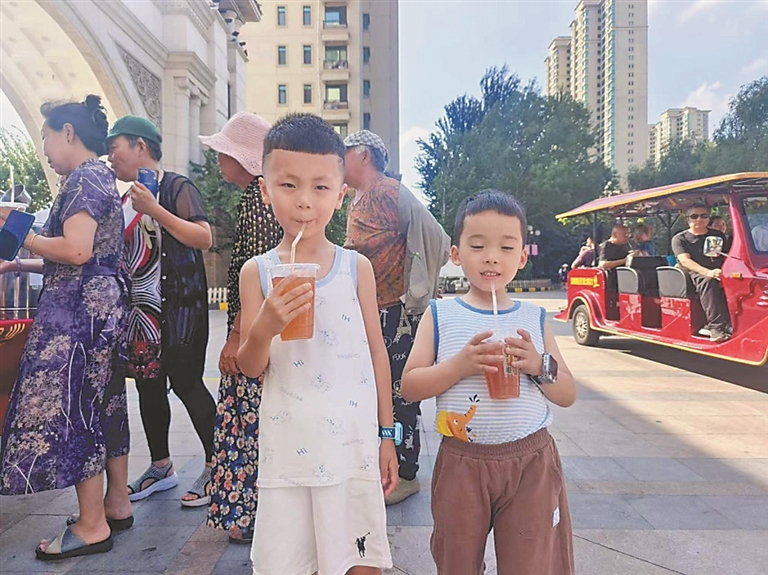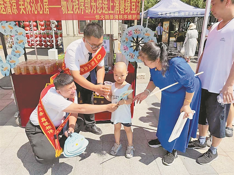 在哈尔滨恒大御景湾小区活动现场,物业工作人员早早备好冰镇绿豆汤,透明杯体搭配活灵活现的卡通贴纸,摊位上还用印有“一扇上岸”“摇钱扇”“扇来好运”等吉祥话语的小扇子摆出了爱心与风车的造型。“这绿豆汤熬得真地道,比家里做的还好喝!”“小扇子又实用又吉利,太贴心了!”业主们手捧绿豆汤,摇着小扇子,脸上满是惬意。活动开始不到半小时,千余杯绿豆汤就派送一空。