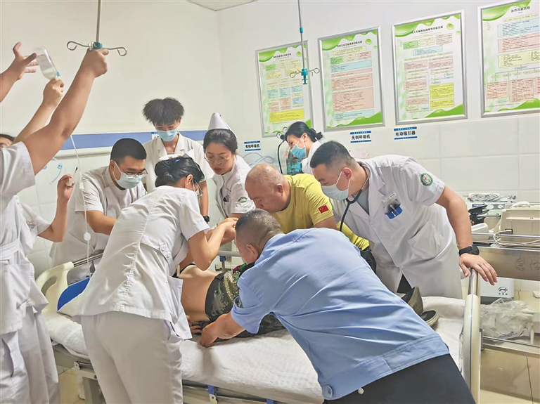 10时17分,急诊科医护人员携带抢救设备火速抵达现场,路过的护士纷纷停下脚步,自动分工,无缝衔接抢救工作。面对意识丧失、口唇紫绀、呼之不应的赵先生,医护人员持续高效心肺复苏,快速建立静脉通路,开放气道,连接心电监护。