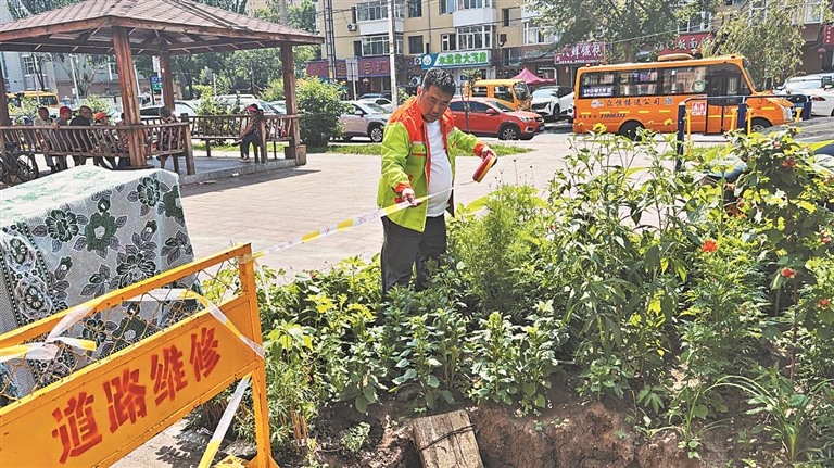 杨波是一名负责园林绿化的专业网格员,来自香坊区园林绿化管护中心。几天前,一场大雨过后,他像往常一样前往网格内街路开展园林巡查。当走到香安街边一处绿化带时,他发现草皮下似乎有轻微的下陷,土壤也被雨水冲出一道道细微沟壑。凭借丰富的经验,杨波敏锐地意识到这可能不只是简单的绿地沉降。他立刻记录现场位置,拍摄下陷区域照片,上传至智慧城管平台。