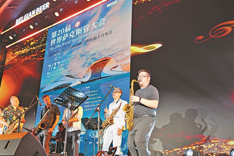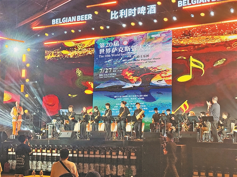 生活报讯 (记者吴海鸥 王晓晨) 当萨克斯的金色旋律漫过防洪纪念塔的台阶,哈尔滨的夏夜随即被点燃!28日晚,“第20届萨克斯管大会惠民演出”在这里上演。悠扬与激情交织的乐声划破夜空,将松花江畔化作巨大的露天音乐厅。记者了解到,第20届萨克斯管大会举办期间,来自中国、美国、澳大利亚、泰国等国家的全明星爵士阵容纷纷在哈尔滨进行街头演奏,让市民和游客近距离感受萨克斯管的魅力。