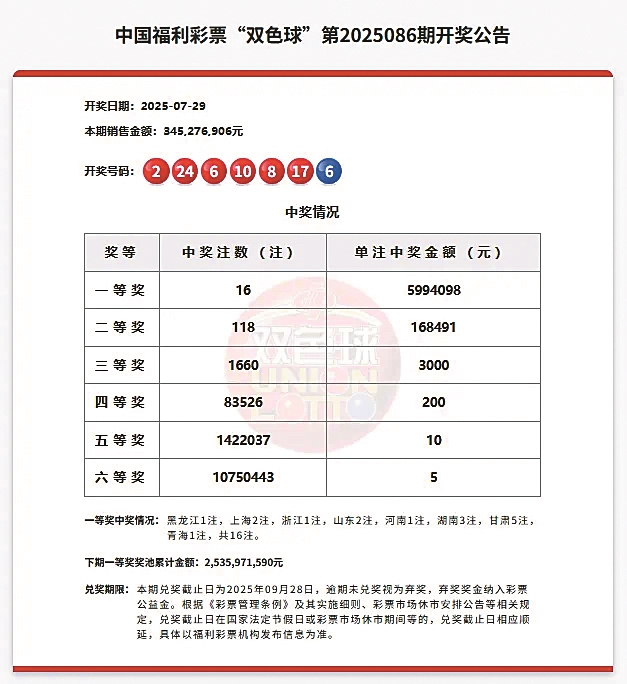 7月29日,双色球第2025086期开奖,一等奖16注,黑龙江(1注)、上海(2注)、浙江(1注)、山东(2注)、河南(1注)、湖南(3注)、甘肃(5注)、青海(1注)。奖池金额25.35亿元,本期销量3.45亿元,筹集公益金1.24亿元。