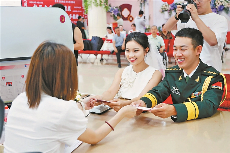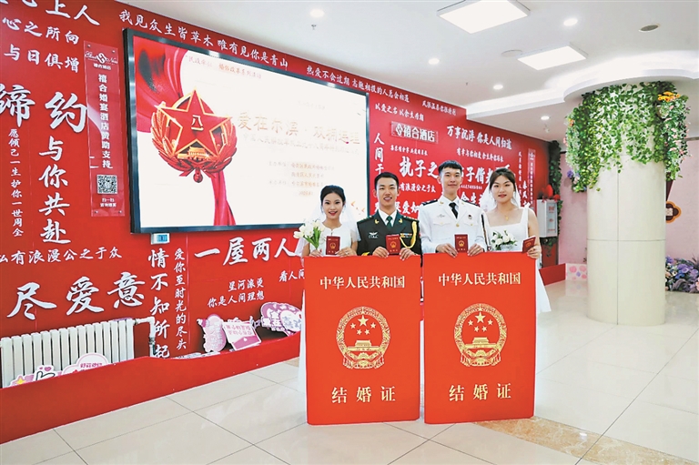 当日,南岗区婚姻登记处为部队新人们设立了绿色办理通道,来自驻哈某部的军官王应实的夏常服与未婚妻陈慧敏雪白的头纱相映成趣。“从战位到婚位,变的是身份,不变的是承诺。”——电子屏上的标语为新人们送去祝福。南岗区人民武装部中校副部长仇耐勇担任颁证嘉宾,这位戍边老兵以“四个特殊”表达了他的心情:“特殊的日子见证特殊的爱情,特殊的群体肩负特殊的使命。”他带领新人们宣读结婚誓词,并为新人们送上八一建军节的祝福。