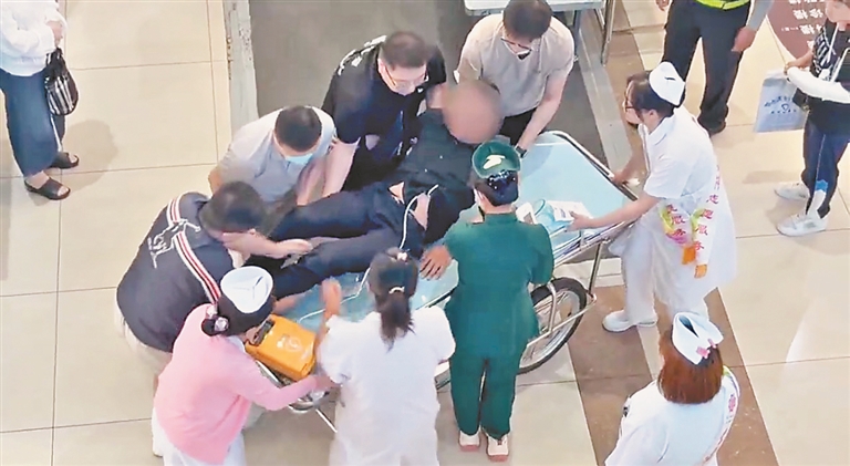 近期,孙大爷总觉得胸口闷痛,犹豫再三,最终选择来到哈尔滨市第一医院就诊。然而,谁也没想到,就在孙大爷刚走过门诊安检口的一瞬间,他的面色骤变,身体一软,重重栽倒在地,意识丧失,呼吸与脉搏全无。门诊导诊护士长孙立丽和几名护士飞奔来到患者身边。“快!推平车!呼叫急诊医生!”孙立丽一边指挥,一边迅速拿AED急救设备。此时正值早上医护人员陆续到医院,正在附近等候电梯的CCU医生王景岩、田枭、心内科医生张玲玲、介入室护士马俊听到呼救声,也迅速冲了过来。没有一丝迟疑,他们立刻跪地施救。医生将电极片贴于患者胸部,进行首次电除颤,但患者意识未恢复。团队继续按压,并实施第二次电除颤,随后患者意识逐渐恢复,可以自主呼吸,能正确应答并辨识所在位置。此时大家终于松了一口气,随后众人将患者送往急诊科。