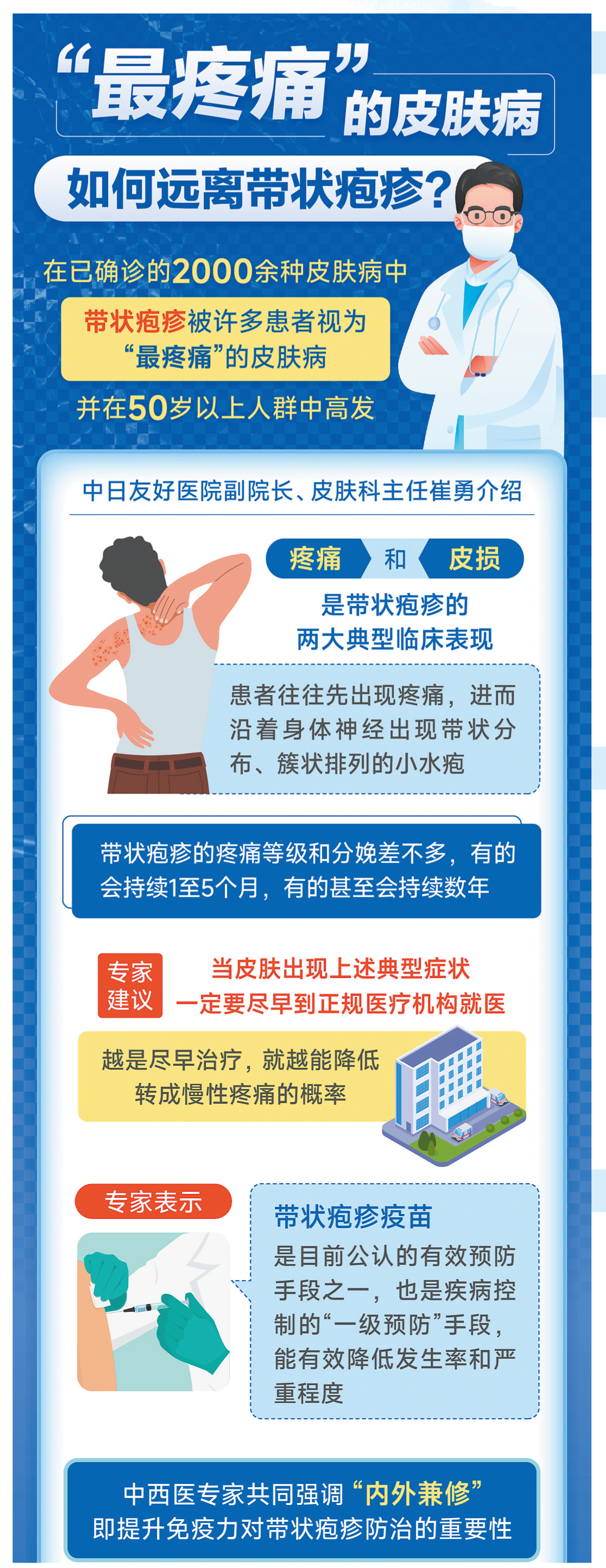 据介绍,带状疱疹是一种常见的感染性疾病。据统计,超过90%的成人体内都潜伏着水痘-带状疱疹病毒,病毒在初次感染(通常表现为儿童时期的水痘)后,不会被身体完全清除,而是会“蛰伏”在体内。当人体因年龄增长、患有慢性病、过度劳累、精神压力大等原因导致免疫功能下降时,这些潜伏的病毒便会卷土重来,沿着神经走向复制和传播,引发剧烈的疼痛和成簇的水疱。