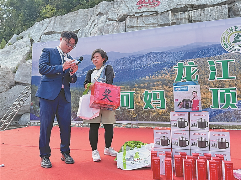 作为龙江森工清河妈妈顶首届登山节的福利,游客们在下山后还参与了景区组织的抽奖活动。电饭锅、精美玉镯、定制帆布包一一送出,“主打”一个让大家满载而归。“一来到山里,什么烦恼都没有了。总体来说,吃住玩都满意,没待够啊,明年还来!”