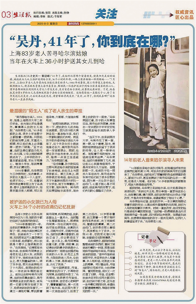 生活报讯 (记者史天一 黄迎峰) “吴丹,41年了,你到底在哪?”7月29日,上海83岁老人乌华荣通过生活报发出寻人请求,希望找到1984年夏天护送其女儿从上海到哈尔滨的同济大学学生吴丹。8月3日,一则特殊的寻人启事在《生活报》刊发后引发广泛关注。令人感动的是,报道见报当日,吴丹便通过朋友转发的文章联系到记者,这场跨越世纪的寻找,在数字化时代画下温暖句点。