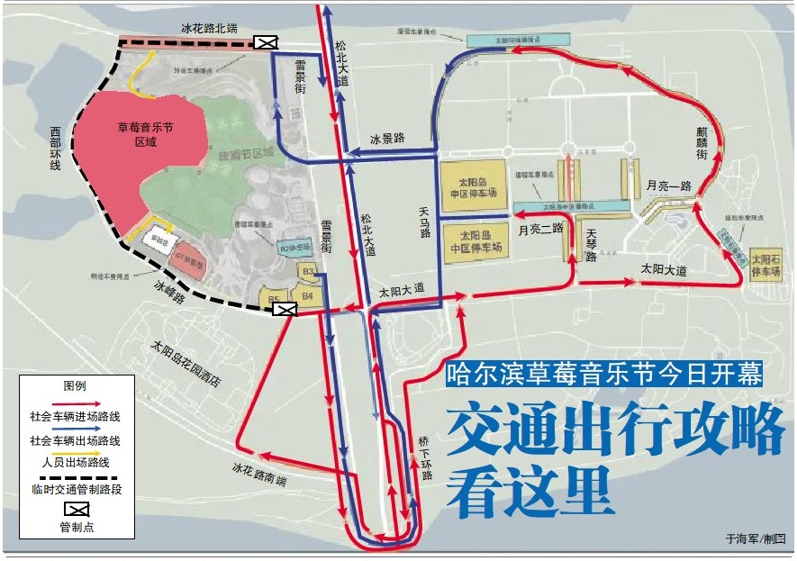 对音乐节活动现场冰峰路(冰霜路→冰花路北端)、冰花路北端(冰峰路→冰景路隧道)采取临时交通管理措施。此外,将根据音乐节活动现场交通流量情况,适时对松花江公路大桥、松北大道采取远端分流管控。