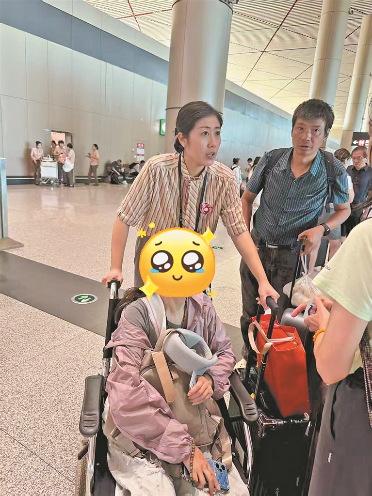 在K7128次列车上,胡女士和熟悉的骨科专家通过电话沟通伤情,专家告知了应急处置方法,并特别叮嘱“千万别踩地,哪怕一点点力都可能错位。”这让胡女士犯了愁:3000多公里的行程、火车+飞机的中转过程,该怎么才能“不踩地”呢?