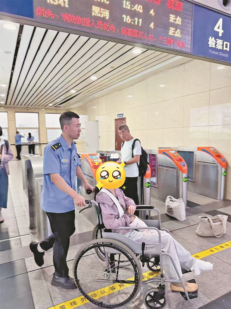在伊春站检票口,剧烈的疼痛让胡女士脸色发白。一位工作人员一眼看到了被搀扶的她,未等求助便上前询问,得知情况后,工作人员迅速开启人工通道,随即推来轮椅,稳稳将胡女士送进车厢。“可惜我当时忘了询问这位工作人员的名字,特别想向他表达谢意。”胡女士遗憾地表示。