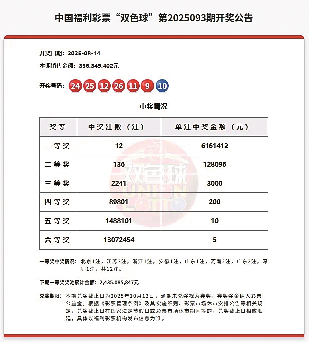 8月14日,双色球第2025093期开奖。一等奖12注,北京(1注)、江苏(3注)、浙江(1注)、安徽(1注)、山东(1注)、河南(2注)、广东(2注)、深圳(1注),奖池金额24.35亿元。本期销量3.56亿元,筹集公益金1.28亿元。