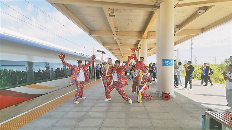 17日,记者早早来到齐齐哈尔南站,客流不少。站台上,年轻的铁路职工身着东北民俗服饰,为迎接哈齐高铁十岁生日载歌载舞,让乘车的旅客沉浸在欢乐的气氛中。