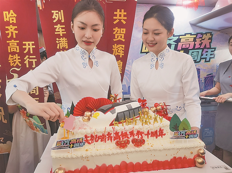 演出接近尾声时,哈齐高铁车组还和现场旅客分享了哈齐高铁十岁生日蛋糕。郭建忠向记者介绍,“我见证了哈齐高铁的发展。我大学是在哈师大音乐学院读的,当时从齐齐哈尔到哈尔滨我记得是3个半小时的旅程,感觉挺遥远,后来慢慢的到特快是2个半小时,再后来哈齐高铁让这段旅程缩短到了1个半小时。今天哈齐高铁十周年,我来表演,衷心祝愿哈齐高铁十岁生日快乐!”