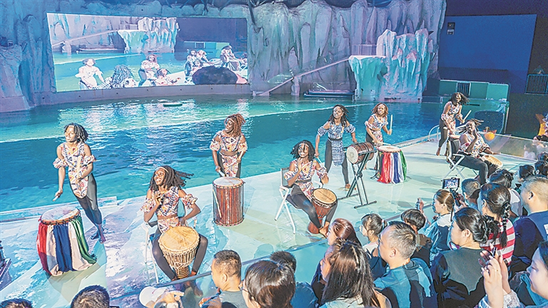 在极地公园海豚秀开场,艺术团倾情上演经典节目《班珠尔达姆巴——坚韧的节奏》,这场演出节目曾多次登上国家级舞台,9位身着民族传统服饰的冈比亚姑娘以震撼人心的鼓乐与舞蹈,诠释着女性在非洲音乐世界中的变革力量。激越的非洲鼓点响彻场馆,裹挟着野性与生命力,瞬间点燃全场热情,游客的掌声与喝彩声如潮,纷纷沉浸在这场跨越国界的艺术盛宴中。