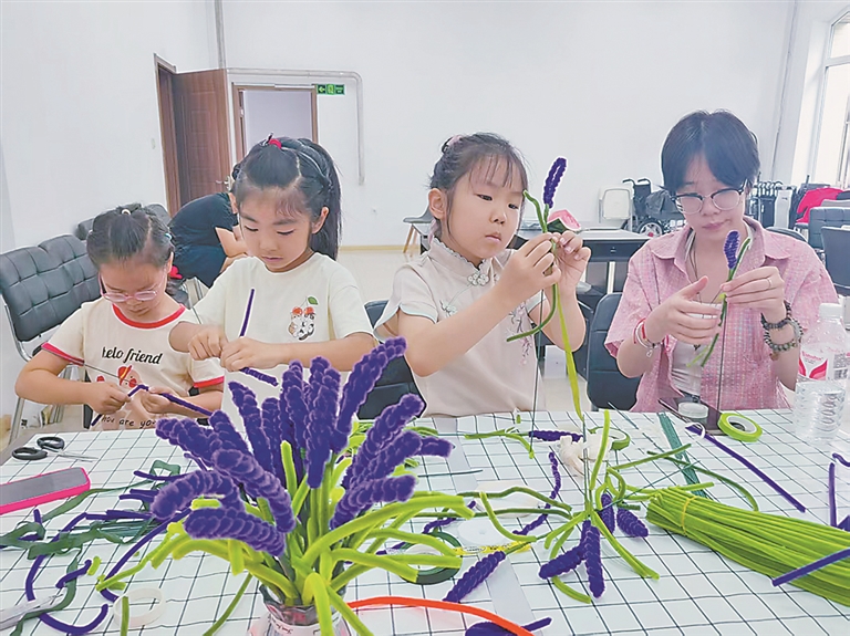 “不仅管得住,还教得好!”快递员李女士说,女儿回家后总兴奋地展示手工课做的薰衣草扭扭花,还会给她展示乒乓球技艺、弹琵琶给她听。除了兴趣课程,社区还组织“夏日送清凉”社会实践,孩子们带着冰镇饮料为户外劳动者送去问候,在体验奉献中成长。