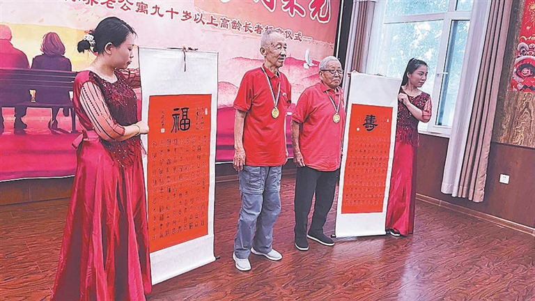 “请蔡老、臧老上台!”随着主持人的邀请,金牌长寿老人、101岁的蔡毅和臧建伟老人在搀扶下走到台前,公寓优秀志愿者缓缓展开两幅红色卷轴,“百福图”上福字各异,“百寿图”里寿字灵动。“这是我们志愿者连夜装裱的,就想把最实在的祝福送给老人们。”志愿者代表说。