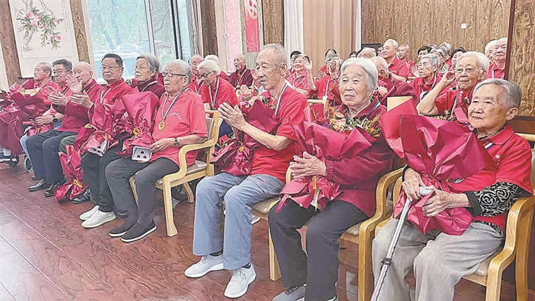 “孙茂晋93岁,曾是投身建设的老工作者;方乐婷91岁,一辈子与人为善……”当主持人念出各位长者的名字与故事时,全场瞬间安静下来,唯有掌声随着介绍声此起彼伏。在授章仪式上,首先颁发的是长寿老人银质奖章,老人们每10人一组走上台,工作人员为他们佩戴上象征长命百岁的“长寿老人”荣誉奖章,并递上花束。虽然老人们都已年过9旬,但每个人脸上都露出孩子般的笑容。