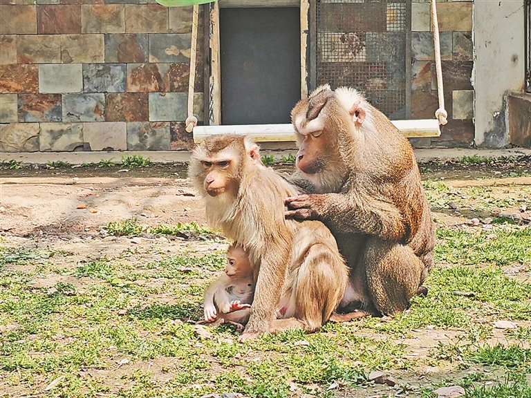 灵长馆的豚尾猴家里,小猴子们在枝丫、秋千、小木屋间疯跑。威武的族长“平顶哥”,此刻安静地坐在地上,时而为妻子“萍萍”理毛、时而低头轻舔毛发;“萍萍”怀抱幼崽,一边安抚宝宝,一边享受着,时而回眸凝视“平顶哥”。