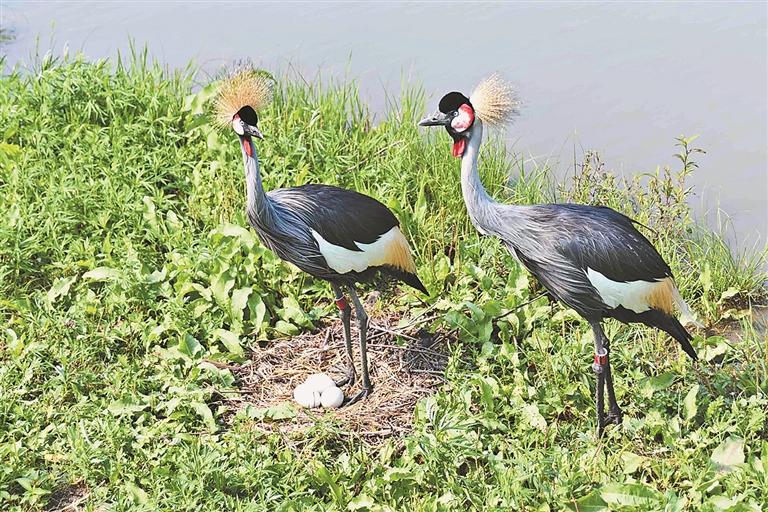 鹤苑栈桥下,有着美丽冠羽的戴冕鹤“翩翩”正用腹羽孵着三枚蓝白色的卵。准爸爸“跹跹”衔来干燥洁净的垫草轻铺巢沿,用翅尖碰了碰“翩翩”,夫妻二鸟对视后换班。它们每隔一小时换班一次,无论日升月落、日晒雨淋,共同承担着抚育后代的责任。