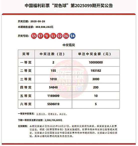8月28日,双色球第2025099期开奖,一等奖中出2注,花落江苏(1注)、河南(1注)。