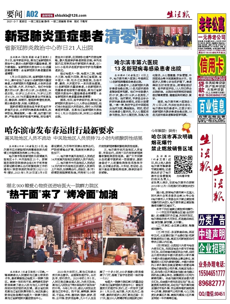 生活报6日讯 (记者张立) 6日,哈尔滨市应对新型冠状病毒感染肺炎疫情工作指挥部发布第23号公告。