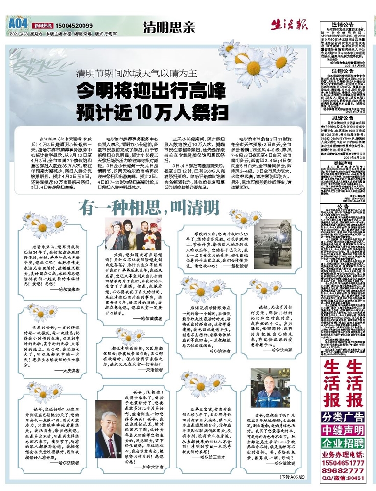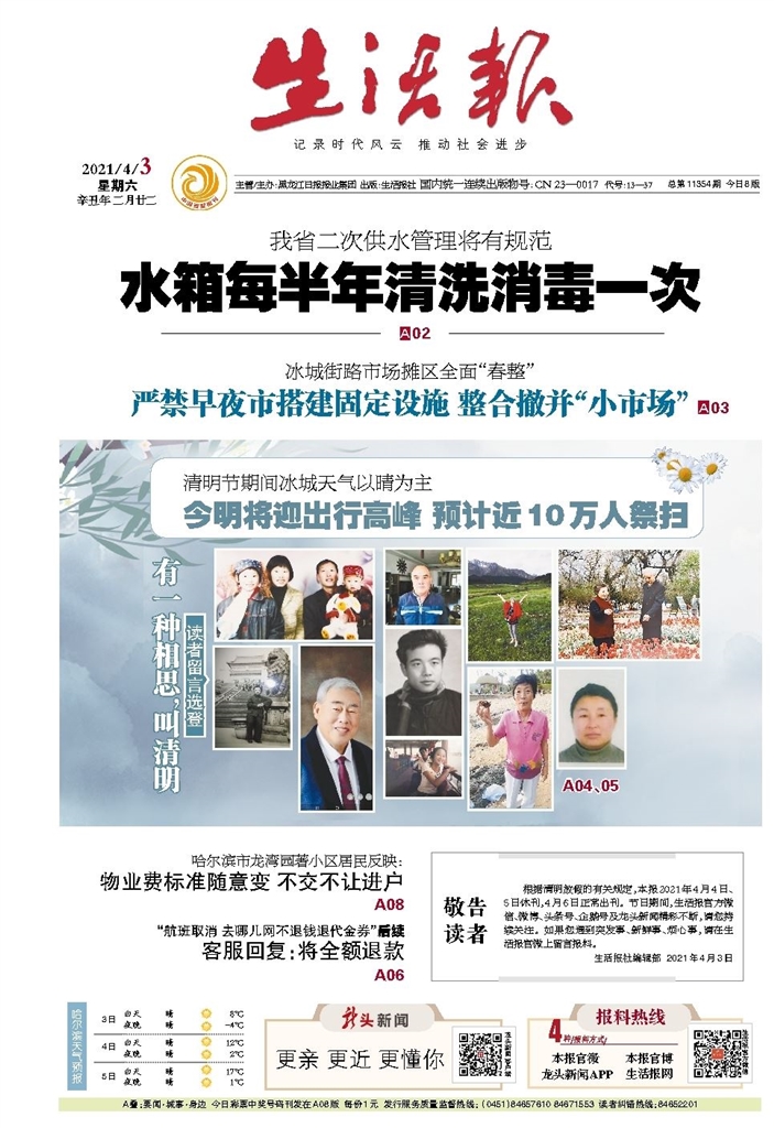 根据清明放假的有关规定,本报2021年4月4日、5日休刊,4月6日正常出刊。节日期间,生活报官方微信、微博、头条号、企鹅号及龙头新闻精彩不断,请您持续关注。如果您遇到突发事、新鲜事、烦心事,请在生活报官微上留言报料。