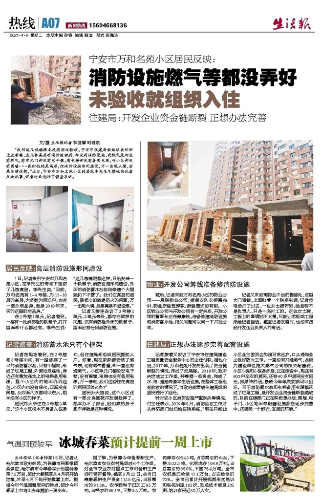“我们这几栋楼根本没有经过验收,宁安市住建局就组织我们回迁进新楼,这几栋高层有消防栓铁箱,却没有消防设施,有燃气表却没有燃气,有单元门却没有电子锁,有电梯却没有备用电