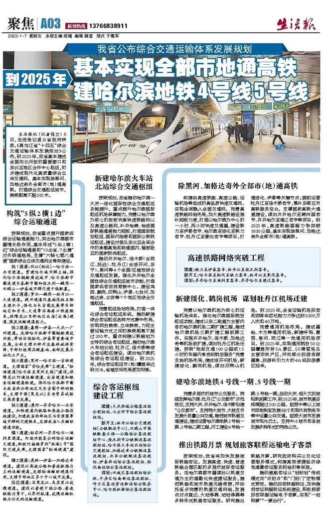 生活报讯 (记者张立) 6日,生活报记者从省政府获悉,《黑龙江省“十四五”综合交通运输体系发展规划》公布,到2025年,我省基本建成全国向北开放的重要窗口和东北亚地区合作中心枢纽,初步建成现代化高质量综合立体交通网。基本实