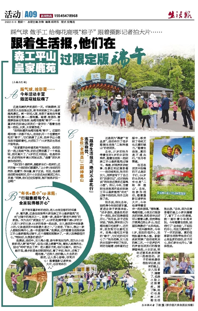3日端午节,生活报联合森工平山皇家鹿苑景区,带游客开启了一场“不一样”的欢乐之旅。踩气球、做手工、给梅花鹿喂“特制粽子”、跟着摄影记者学拍大片、去采摘园里摘草莓……百名团员在欢声笑语中度过了一