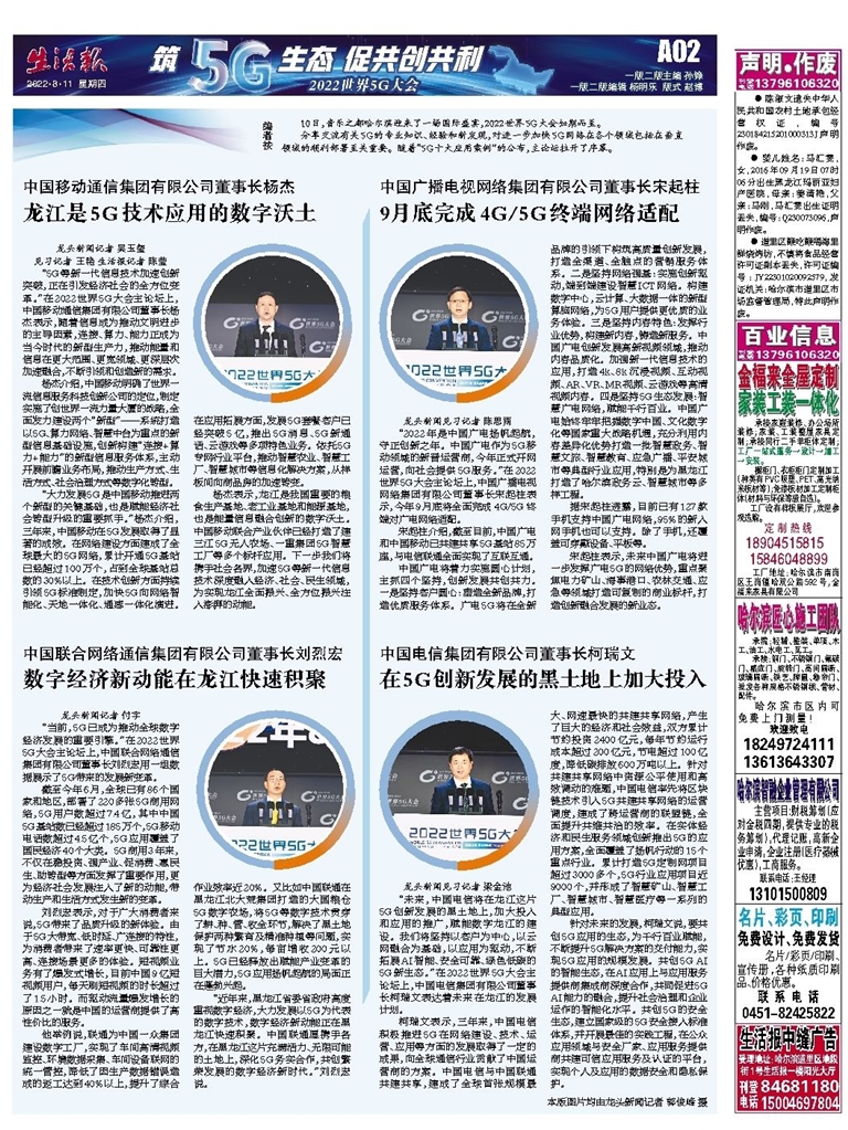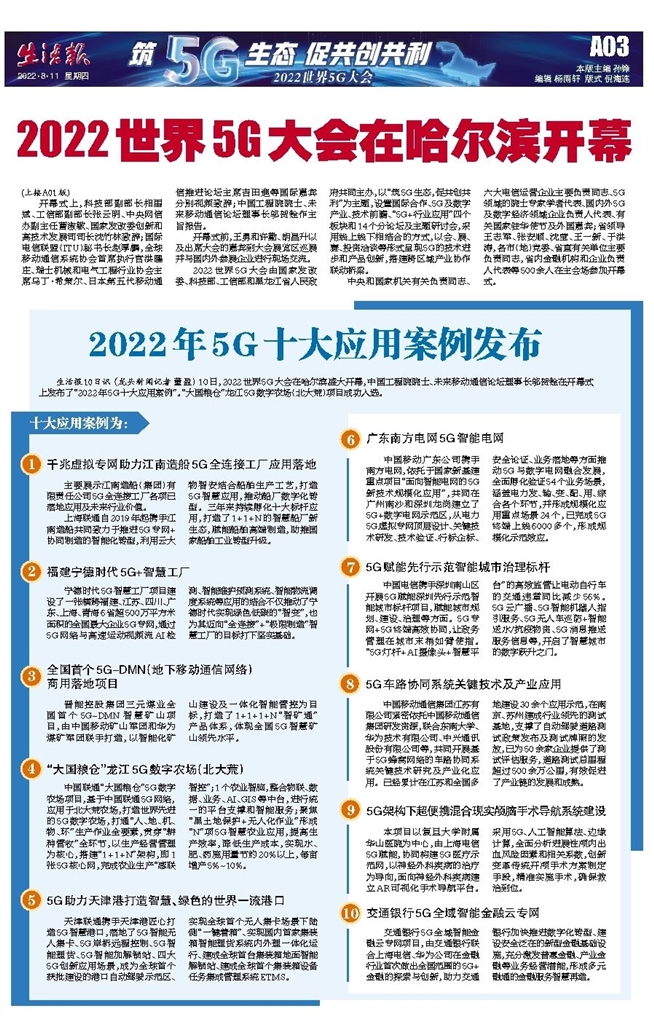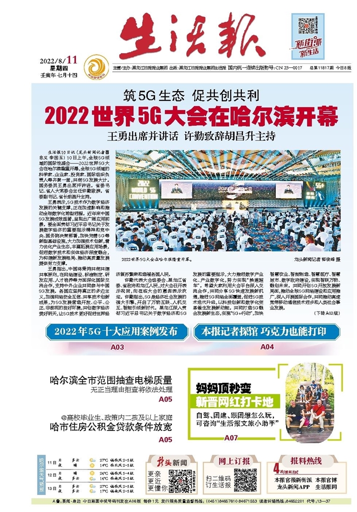 生活报10日讯 (龙头新闻记者曹忠义 李国玉) 10日上午,全球5G领域的国际性盛会——2022世界5G大会在哈尔滨隆重开幕,全球5G领域的科学家、企业家、投资家、国际组织负责人等齐聚一堂,共商5G发展大计。国务委员王勇出