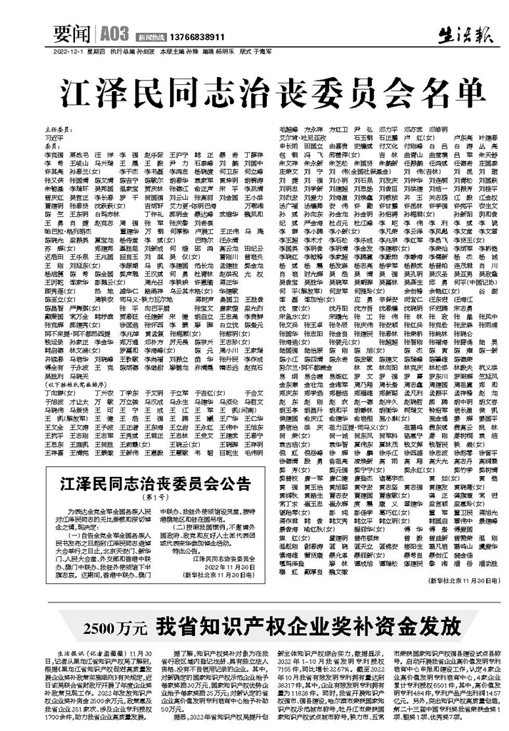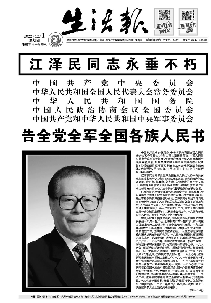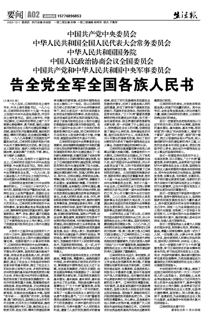 中国共产党中央委员会、中华人民共和国全国人民代表大会常务委员会、中华人民共和国国务院、中国人民政治协商会议全国委员会、中国共产党和中华人民共和国中央军事委员会,极其悲痛地向全党全军全国各族人民通告:我们敬爱的江泽民同志患白