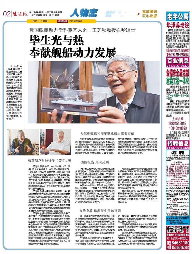 生活报讯 (记者吕晓艳) 生活报记者从哈尔滨工程大学获悉,中国共产党优秀党员,我国舰船动力学科奠基人之一,我国享有盛名的舰船动力领域专家,我国第二代舰船动力发展的见证者和亲历者,哈尔滨工程大学终身荣誉教授王芝秋同志,因病于