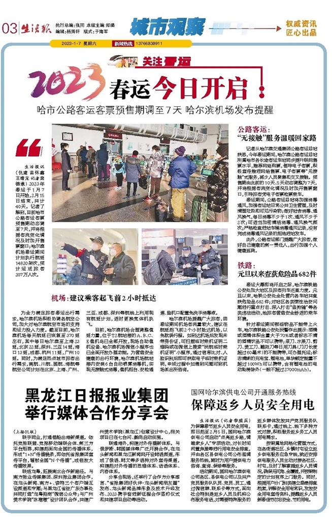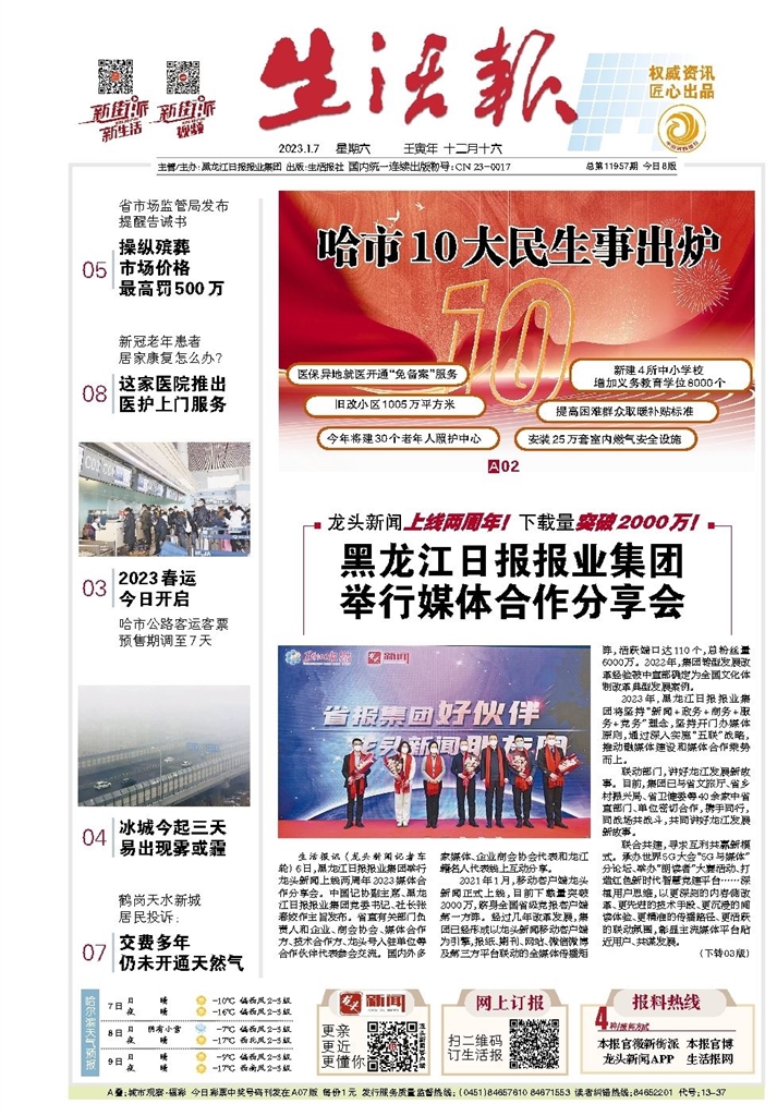 生活报讯 (龙头新闻记者车轮) 6日,黑龙江日报报业集团举行龙头新闻上线两周年2023媒体合作分享会。中国记协副主席、黑龙江日报报业集团党委书记、社长张春姣作主旨发布。省直有关部门负责人和企业、商会协会、媒体合作方、技术合