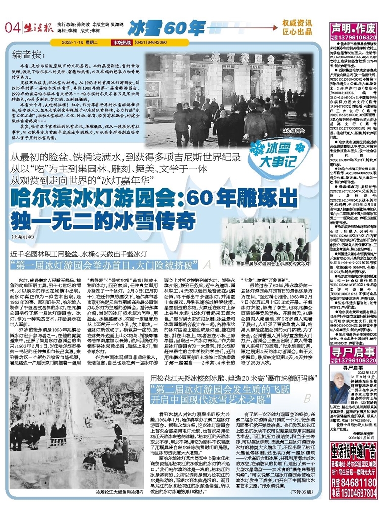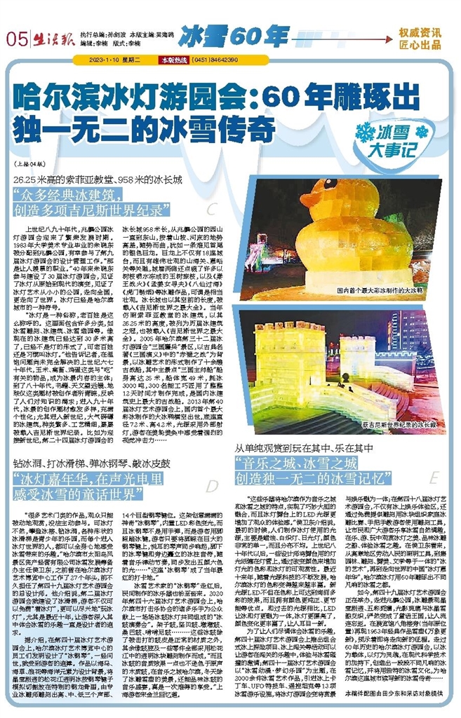 从松花江上古老的渔灯,到兆麟公园里绚丽的冰雕,再到享誉国内外的冰雪大世界,哈尔滨冰灯艺术给世人留下了无数美好的回忆,也记录了一座城市蓬勃发展的轨迹。
