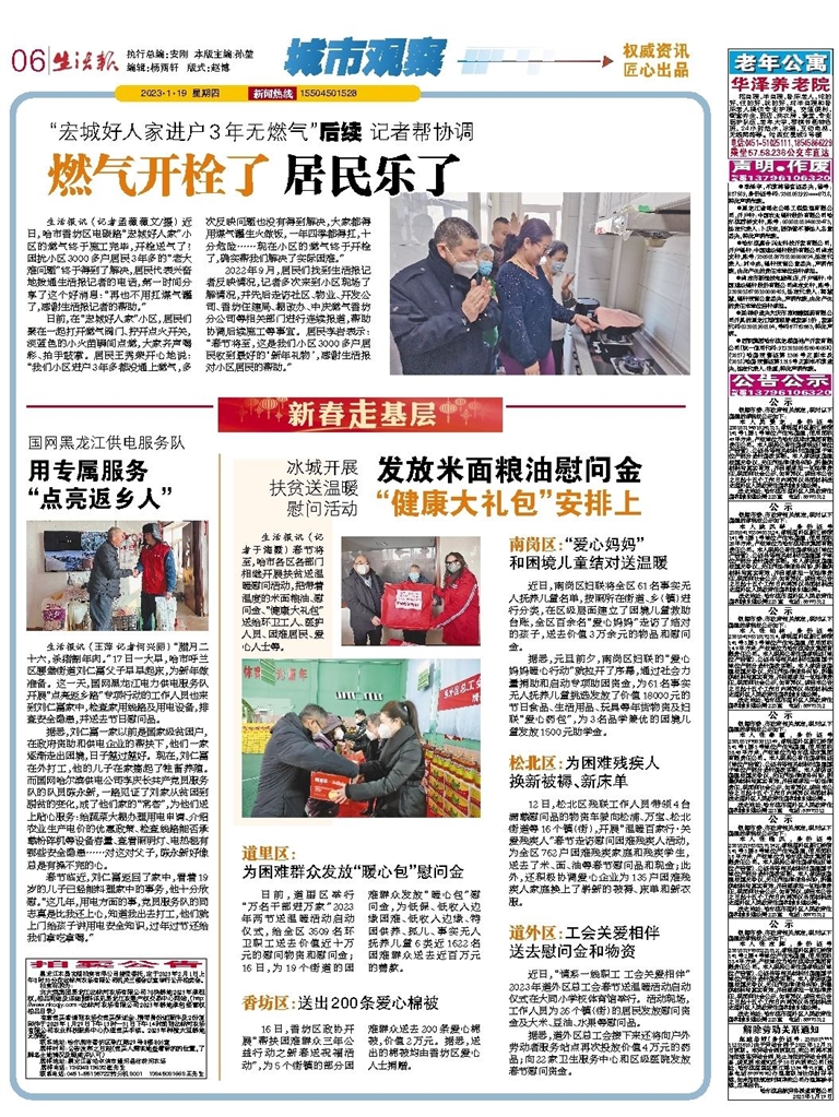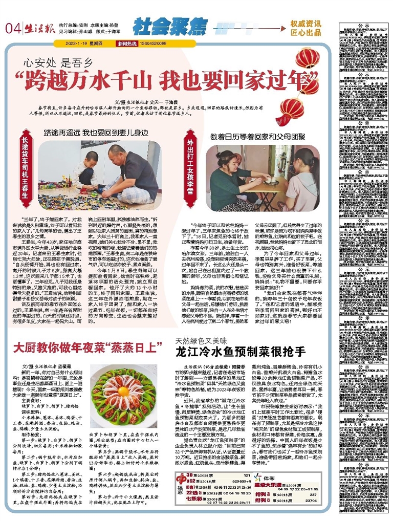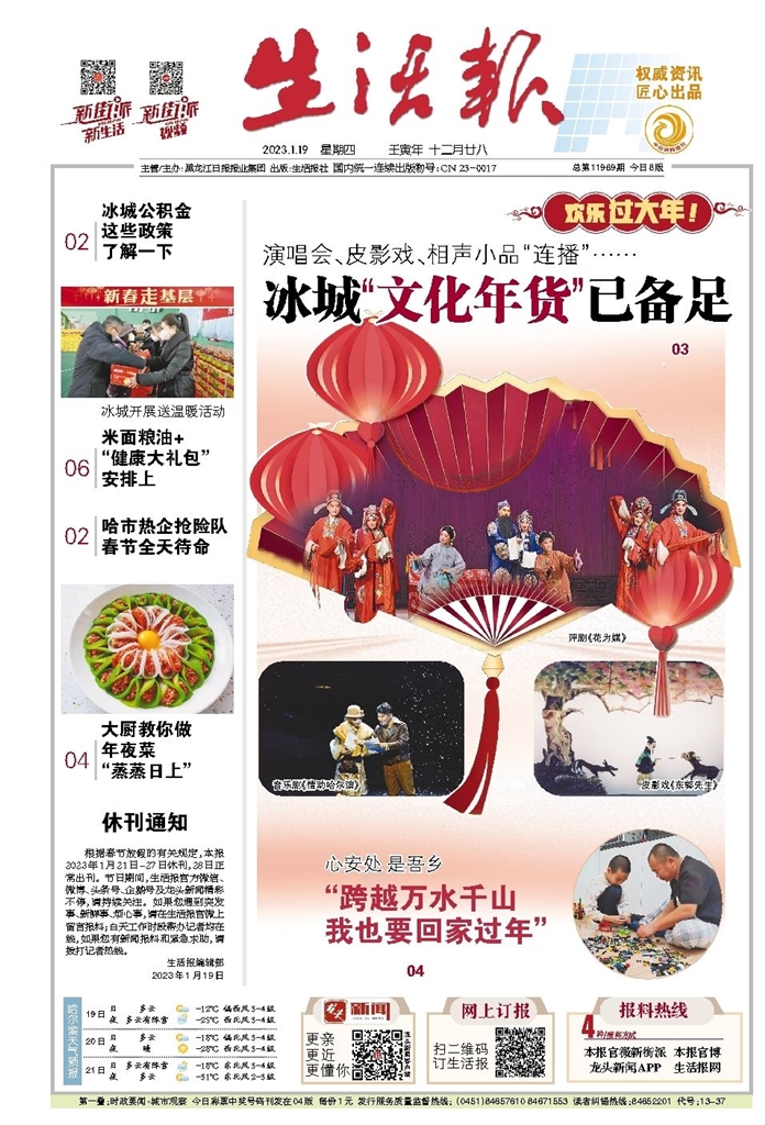 根据春节放假的有关规定,本报2023年1月21日-27日休刊,28日正常出刊。节日期间,生活报官方微信、微博、头条号、企鹅号及龙头新闻精彩不停,请持续关注。如果您遇到突发事、新鲜事、烦心事,请在生活报官微上留言报料;白天工