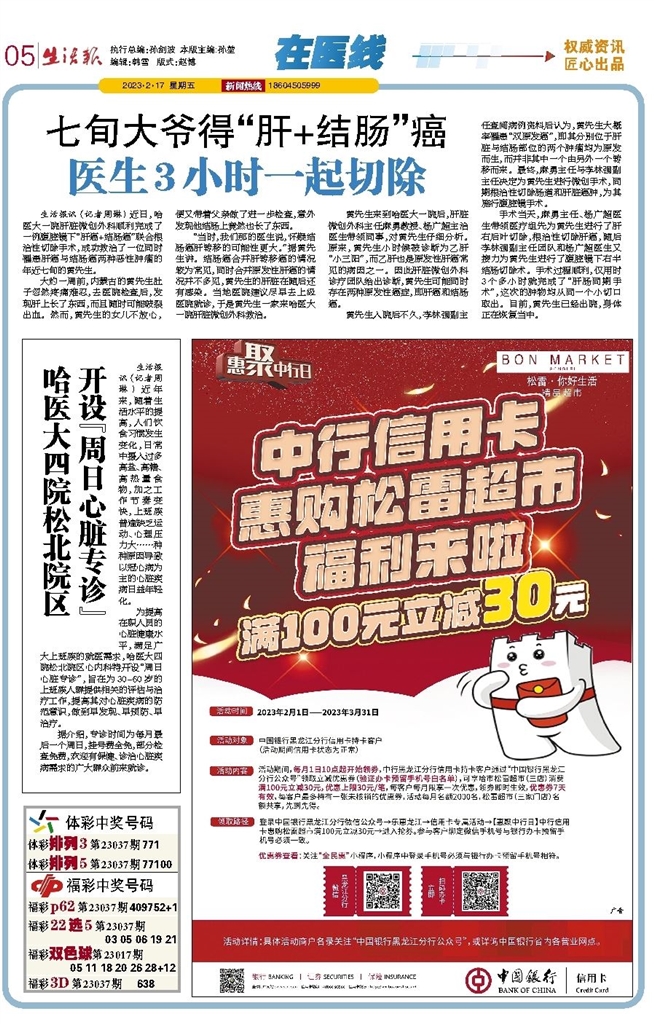 生活报讯 (记者周琳) 近日,哈医大一院肝脏微创外科顺利完成了一例腹腔镜下“肝癌+结肠癌”联合根治性切除手术,成功救治了一位同时罹患肝癌与结肠癌两种恶性肿瘤的年近七旬的黄先生。