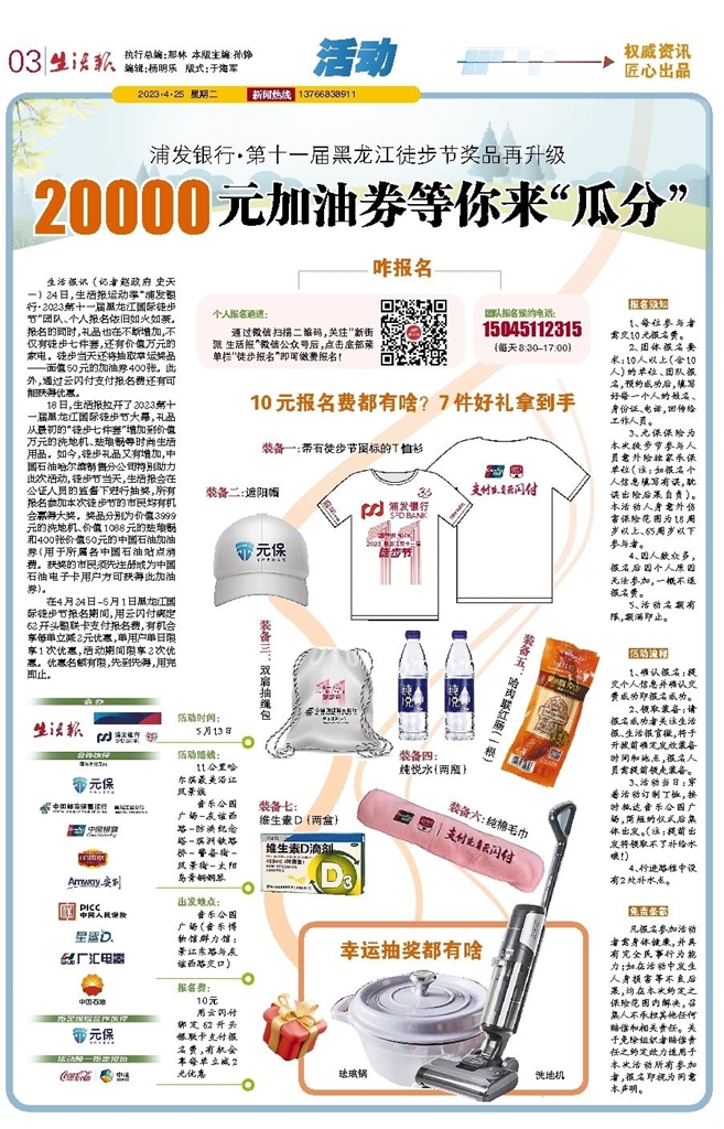 生活报运动季“浦发银行·2023第十一届黑龙江国际徒步节”团队、个人报名如火如荼。报名的同时礼品也在不断增加,不仅有徒步七件套,还有价值万元的家电。5月13日徒步当天还将抽取幸运奖品——面值50元的加油券400张。