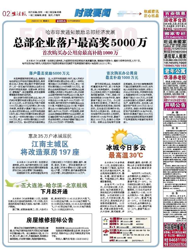 生活报讯 (记者梁晨) 生活报记者获悉,为鼓励和促进总部经济高质量发展,增强城市竞争力、辐射力和带动作用,6月7日,哈市印发《哈尔滨市人民政府关于鼓励总部经济发展若干政策措施的通知》(哈政规〔2023〕12号)。