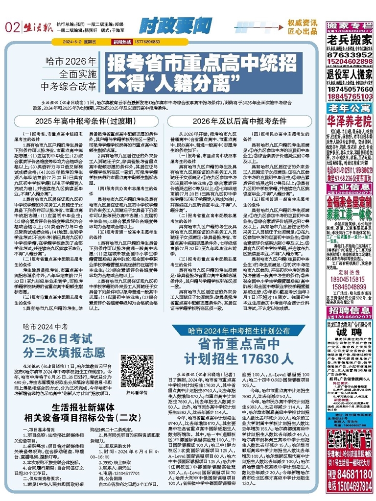 生活报讯 (记者吕晓艳) 1日,哈尔滨教育云平台最新发布《哈尔滨市中考综合改革高中报考条件》,明确将于2026年全面实施中考综合改革,2024年和2025年为过渡期,并发布2025年及以后的高中报考条件。